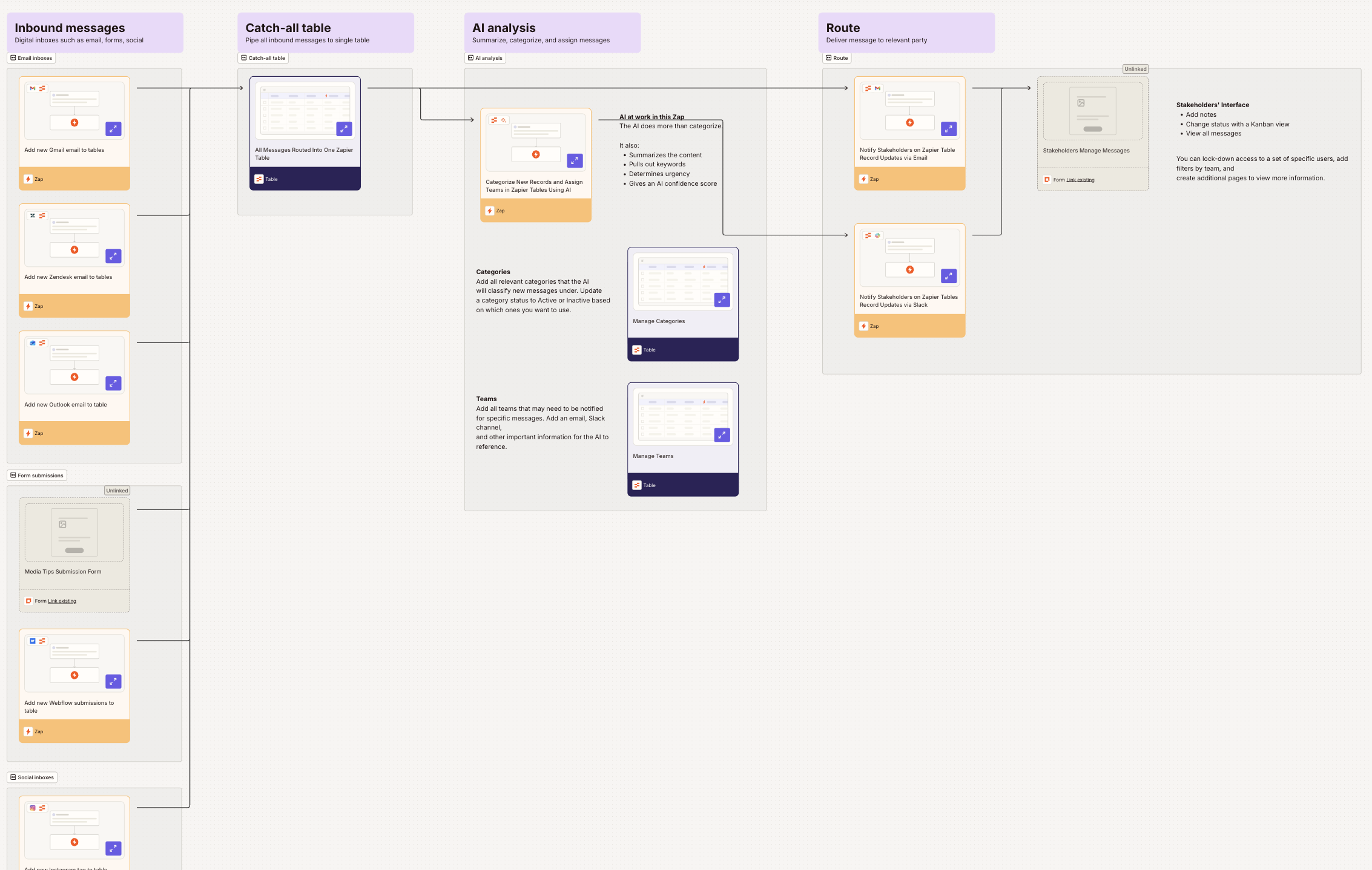 The underlying principle is that AI handles the judgment calls, while automation handles the execution. When someone submits a support ticket, AI classifies it by urgency and topic, then the workflow routes it to the right queue, creates the right record, and sends the right notification—the same way, every time.